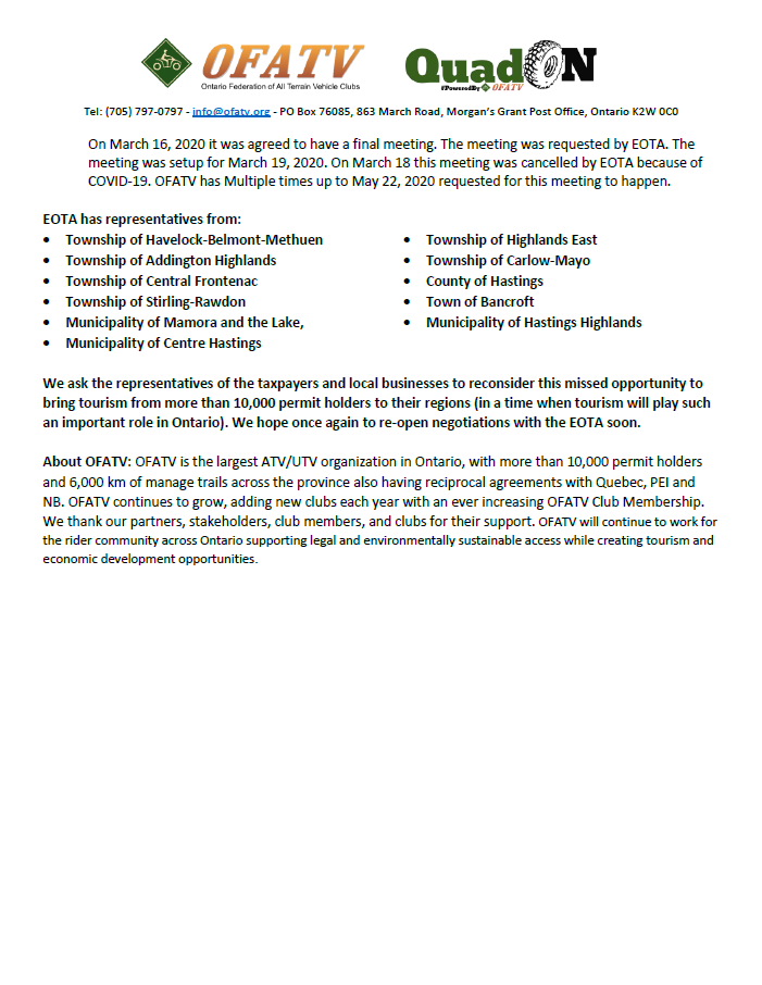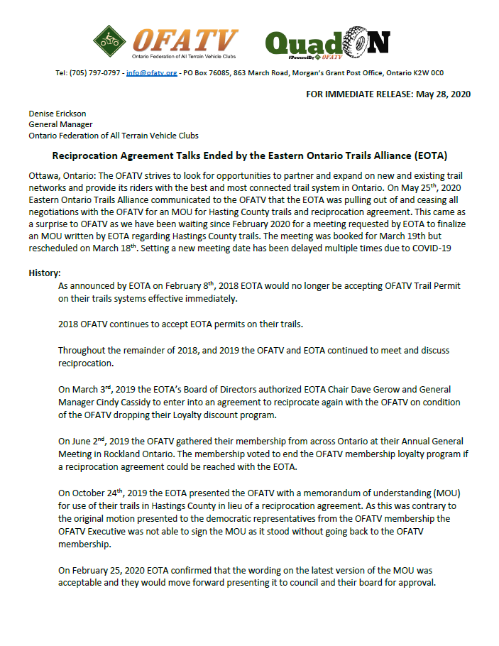 OFATV thanks Eastern Ontario Trail Alliance and Hastings County for their collaboration on this agreement. The two organizations look forward to working together on a more connected Ontario.
